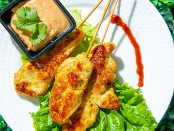 Grilled, marinated, and skewered chicken served with Peanut Sauce