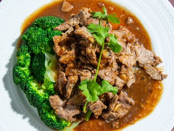 Stir fried cashew, onion, bell pepper, mushroom, carrot, soybean sauce