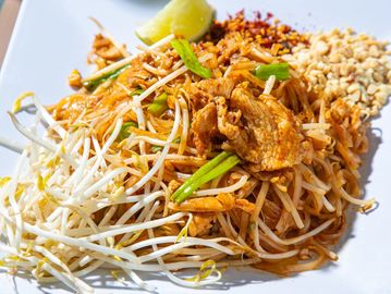 Stir fried rice noodle with egg, bean sprout, green onion, served with peanut and lime