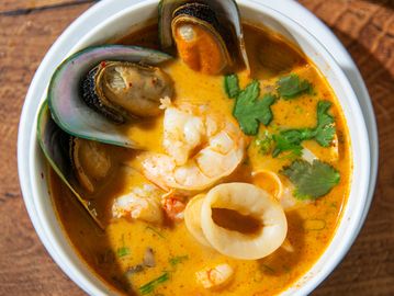 Spicy hot and sour soup with lemongrass, lime leaves, carrots, mushroom, onion, and coconut milk