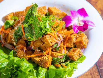 Fried tofu mixed with Thai dressing and crushed roasted rice topping