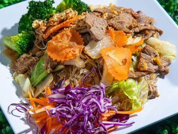 Stir fried glass noodle with egg, onions, cabbage, broccoli, carrot